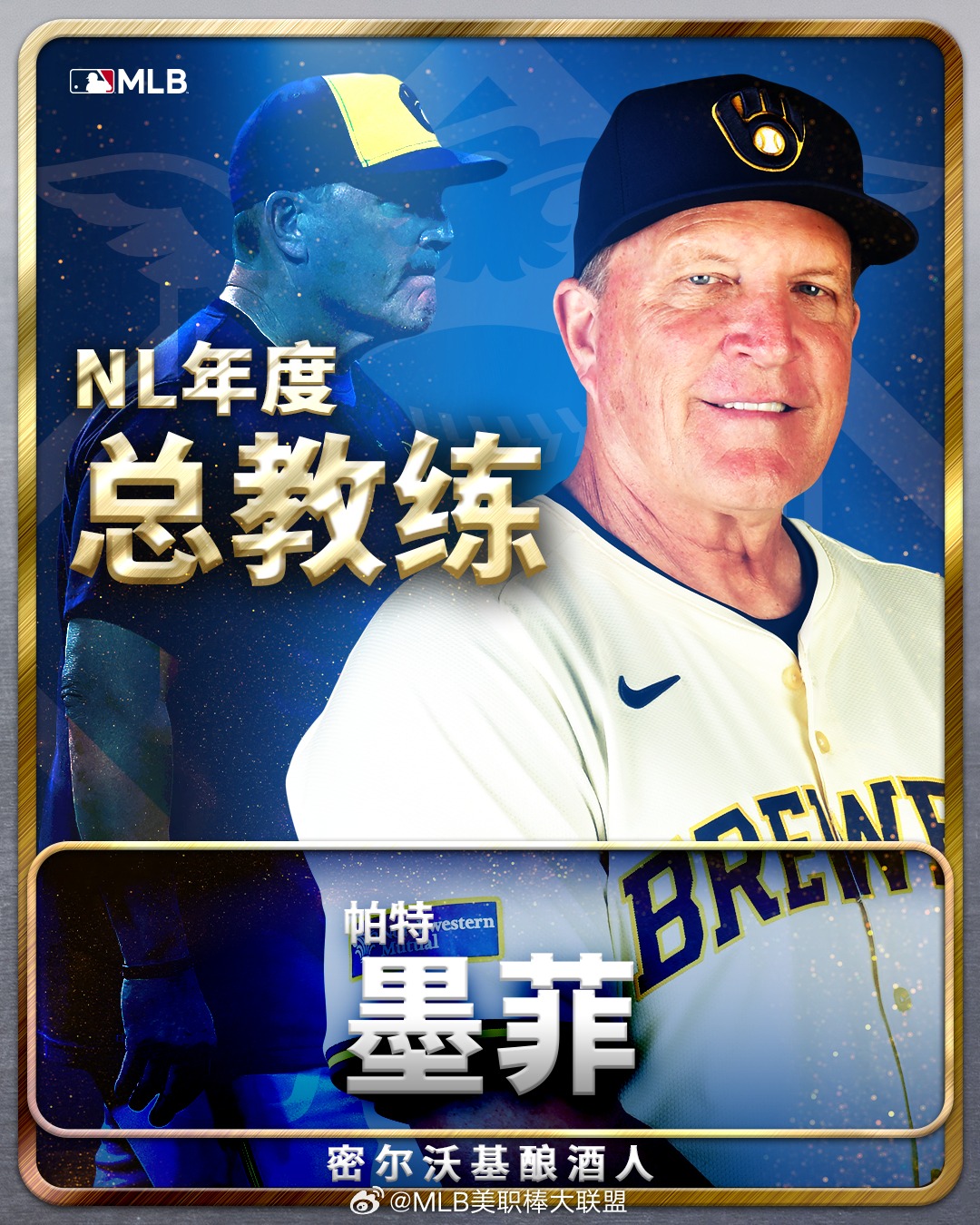 帕特·墨菲被美国棒球记者协会(BBWAA)公布为2024年国家联盟年度最佳教练。他成为酿酒人队史第一位获奖教练,也代表大联盟30队都曾赢下年度最佳教练奖。