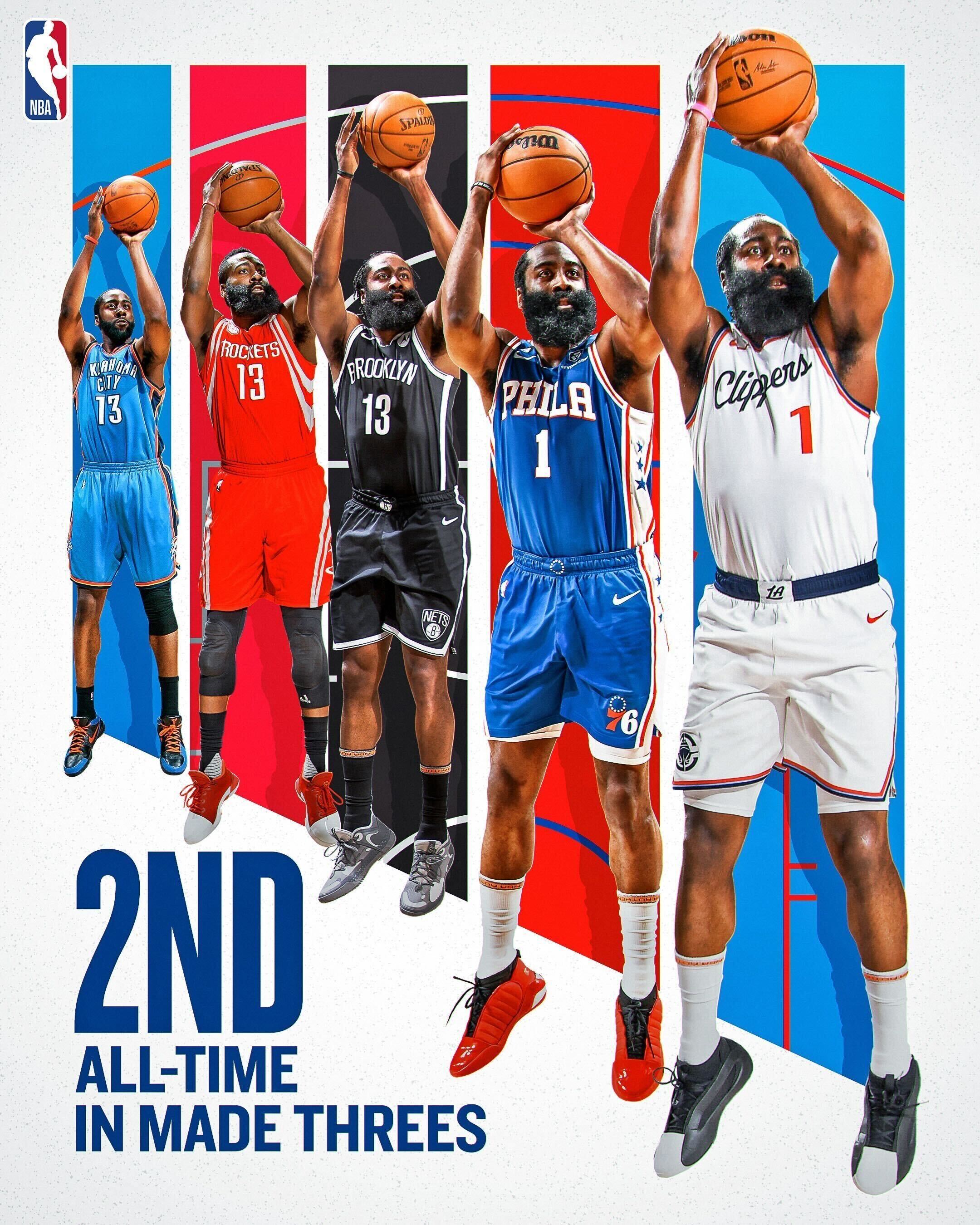 北京时间11月18日讯,今日NBA常规赛,快船主场116-105战胜爵士。哈登此役命中自己第2974记三分,超越雷-阿伦来到NBA历史三分纪录第二位,仅次于库里(3782)。