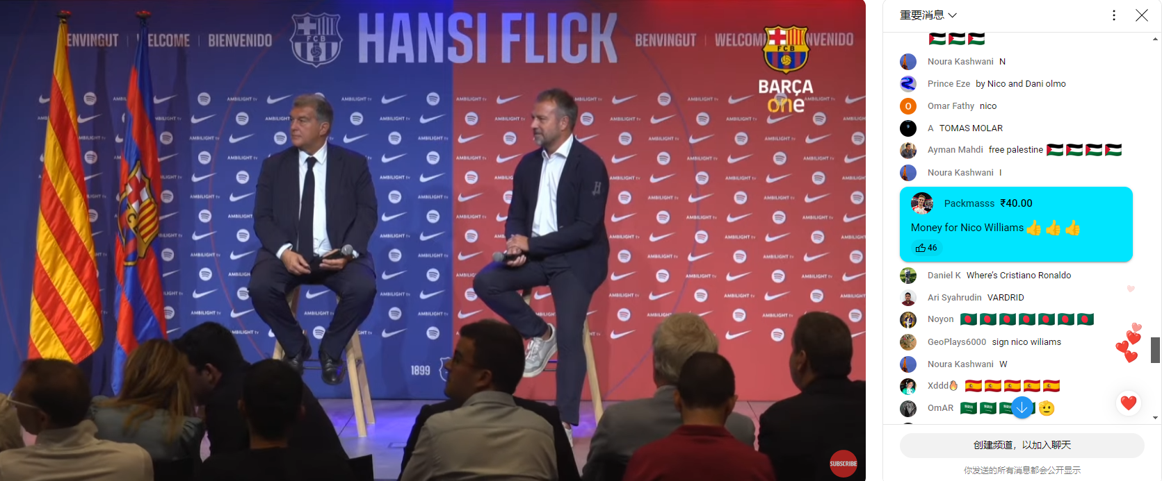 北京时间7月25日。今天,巴塞罗那官方在启程前往美国之前为新任主教练弗里克举行了正式仪式。仪式直播过程中,不少巴萨球迷在直播中不断送出捐款,并评论道,“这些都是为了签下尼科的”。