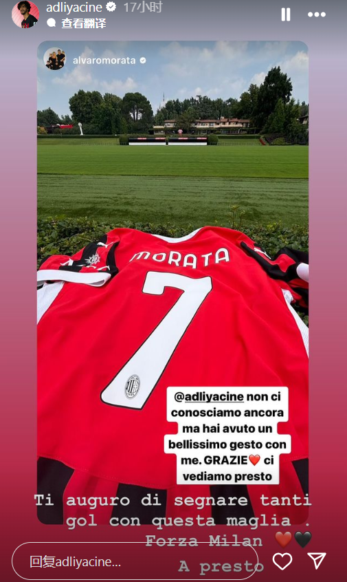 莫拉塔的社交媒体感谢他的新队友阿德利放弃了自己的号码 后者回复道:希望你穿着米兰7号进很多球