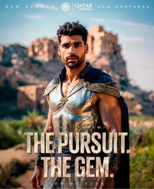 海报中,塔雷米穿着一件古代波斯衬衫,看上去威风凛凛,就像一位古代波斯王子从画面中走出来。