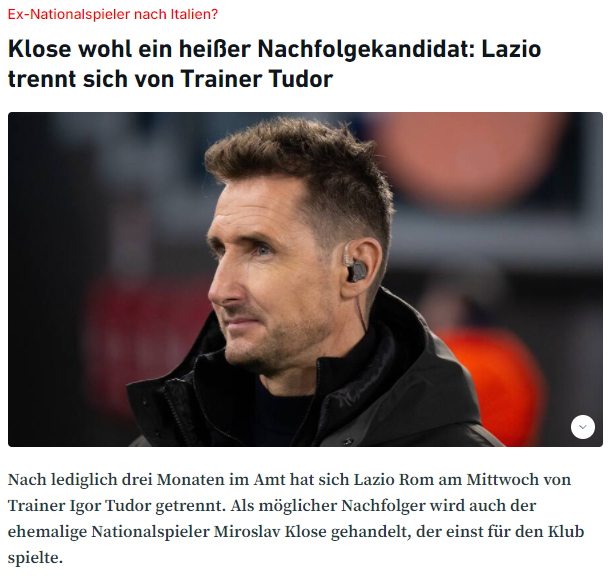据德国媒体《sportbuzzer》报道,意甲球队拉齐奥队主帅图多尔辞职后,俱乐部将目标瞄准了克洛泽作为新任主帅。在球员生涯中,克洛泽曾效力于拉齐奥队。